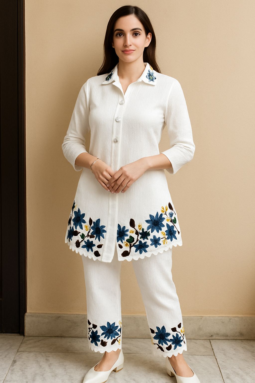 Upgrade your wardrobe with this elegant white cotton co-ord set for women, featuring intricate blue...